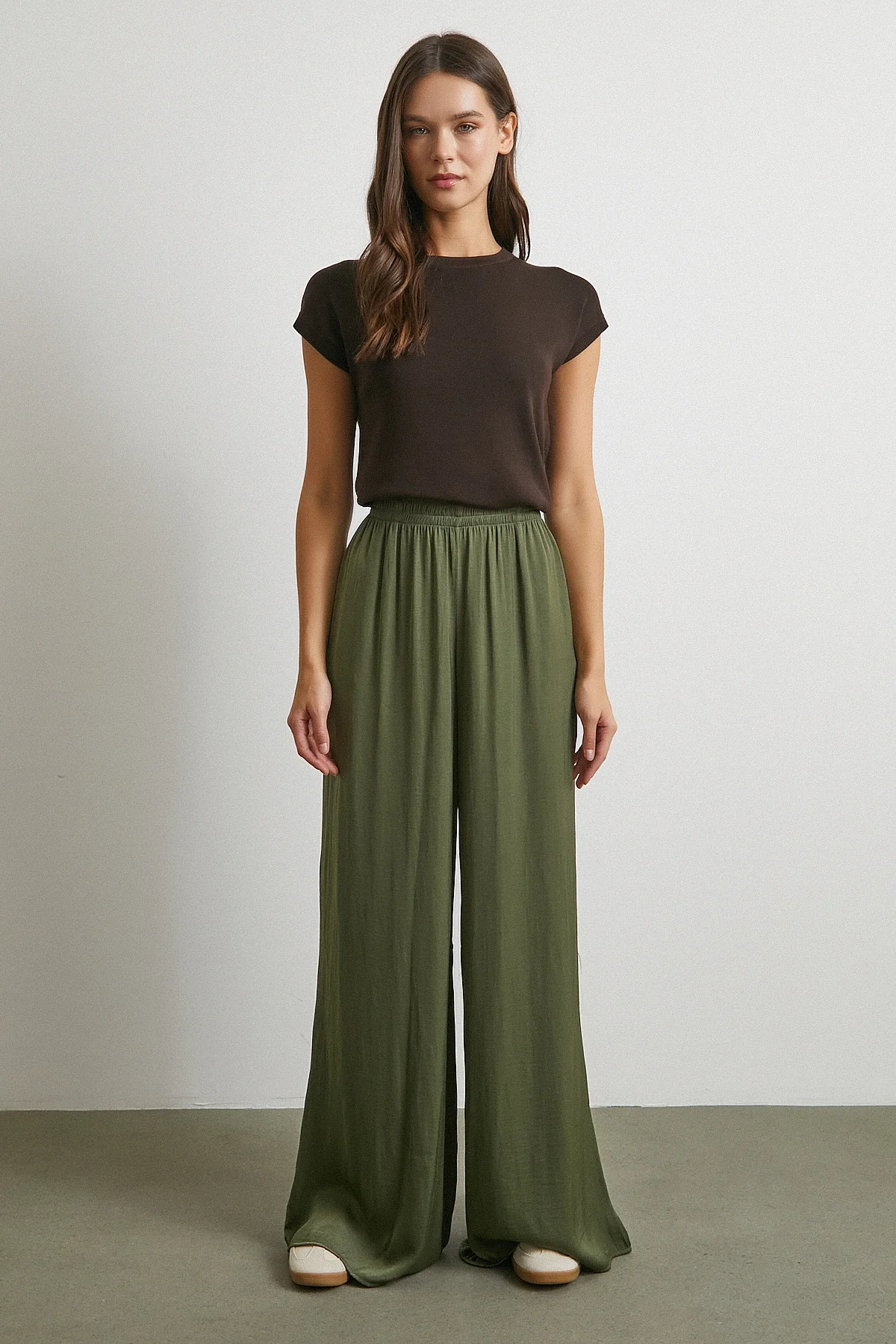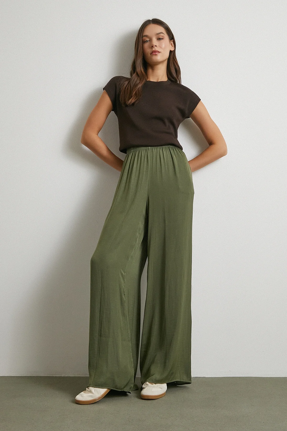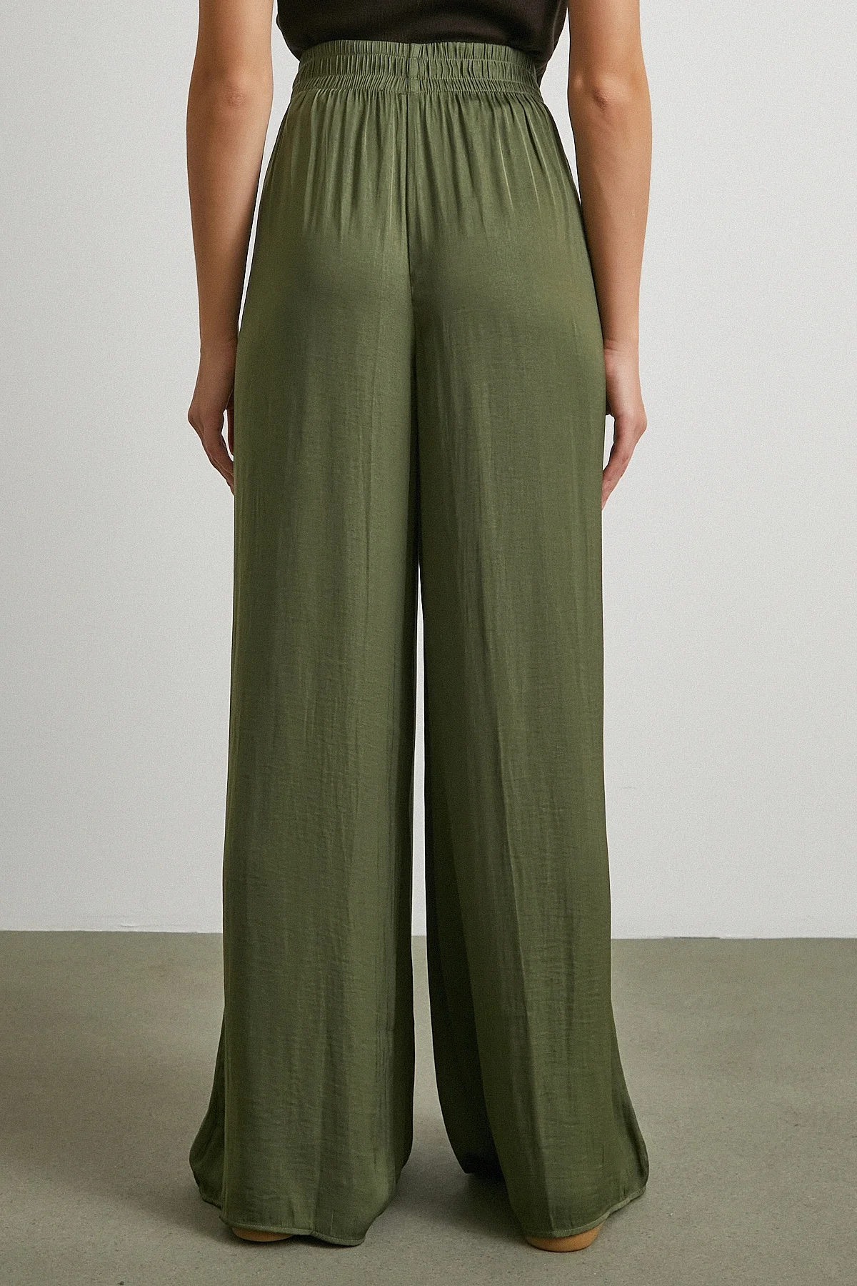 Beli Lastikli Dökümlü Geniş Paça Pantolon - Haki