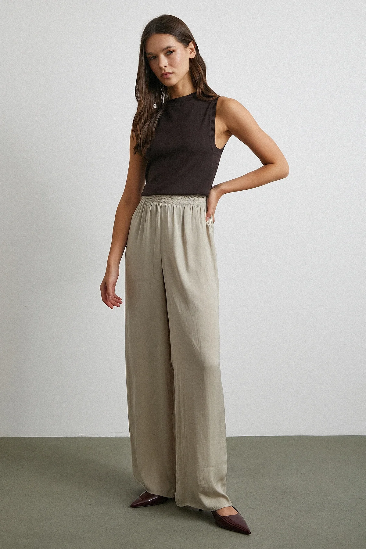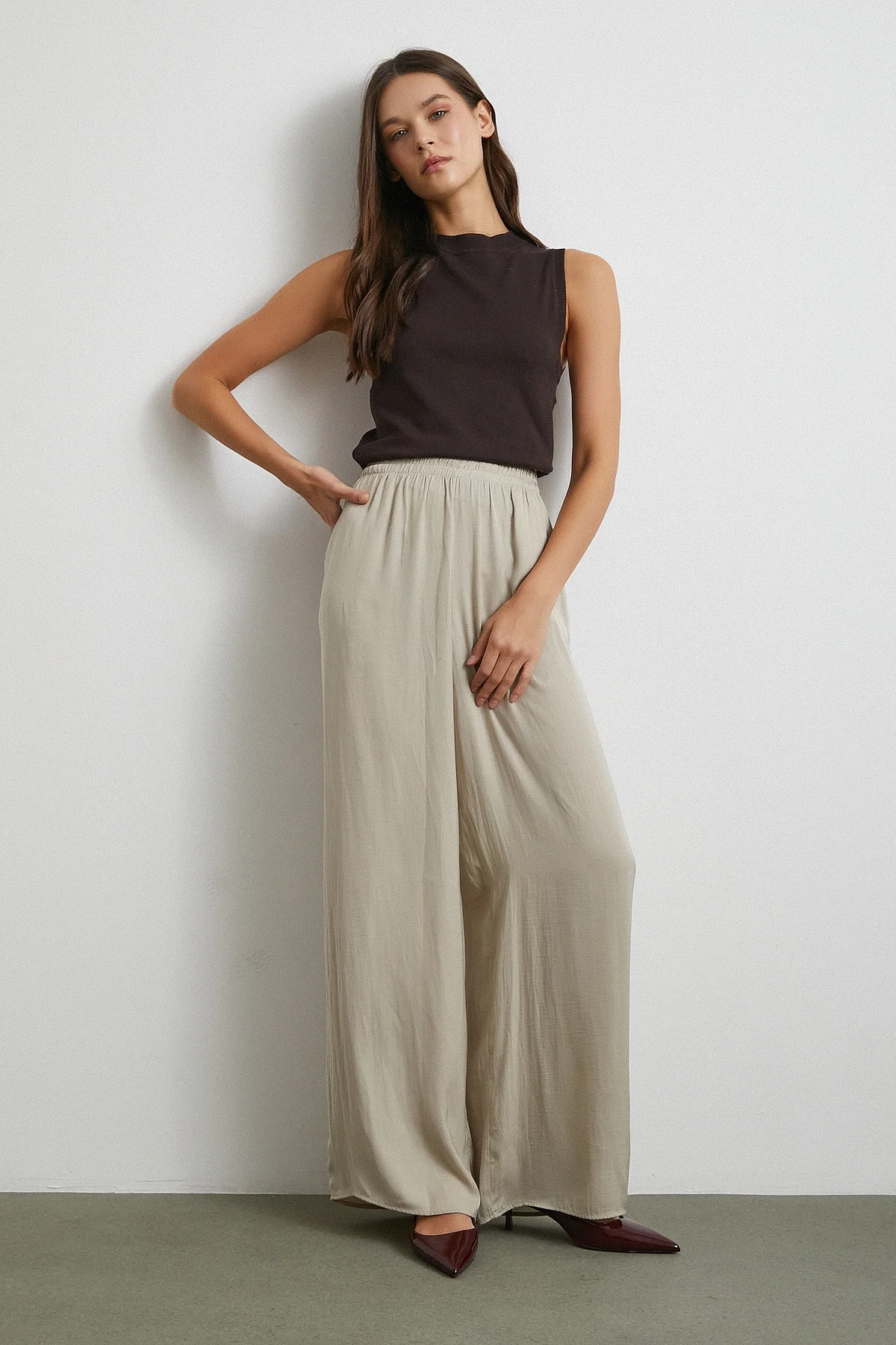 Beli Lastikli Dökümlü Geniş Paça Pantolon - Taş