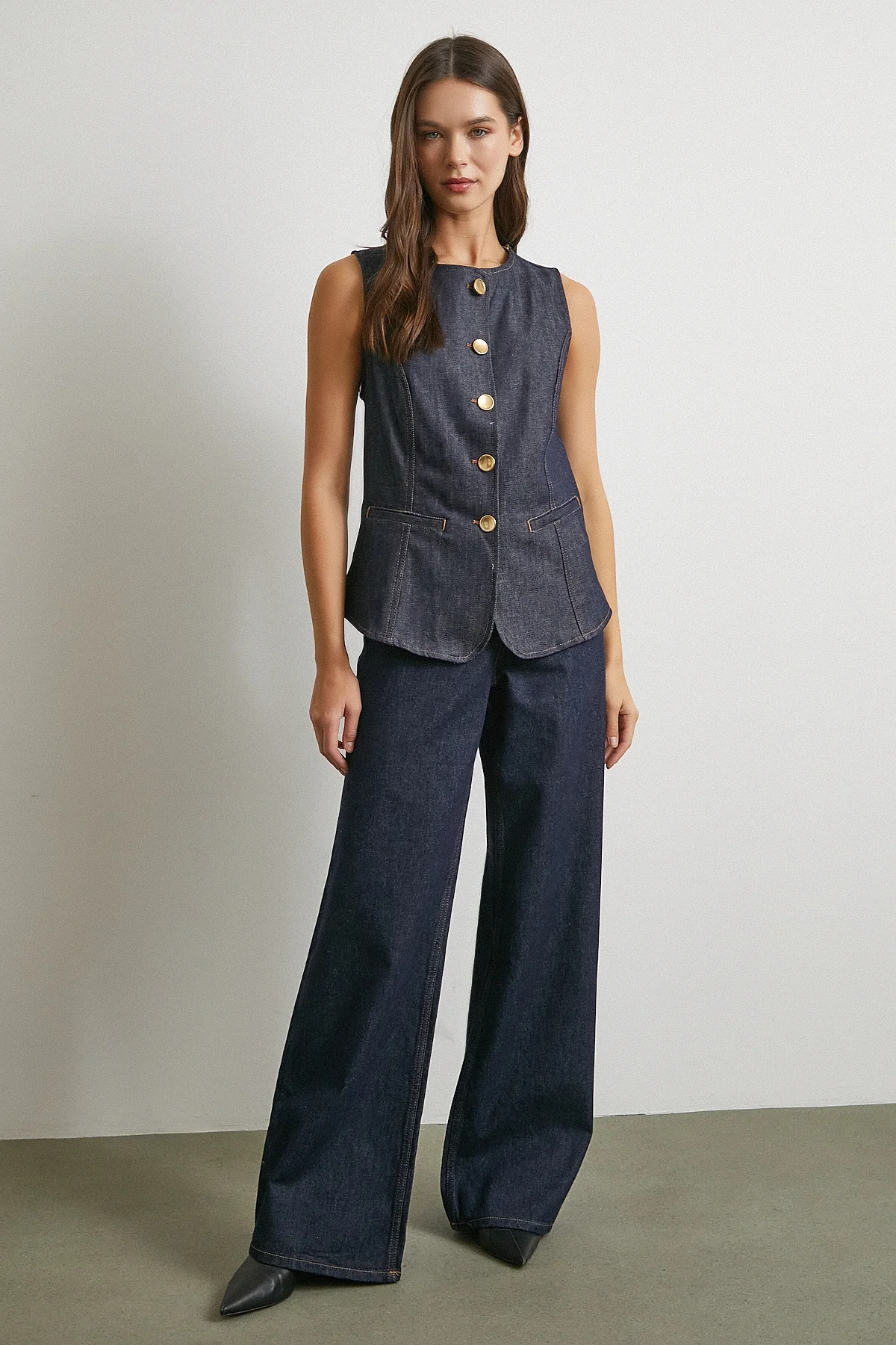 Bisiklet Yaka Metal Düğmeli Denim Yelek - Lacivert