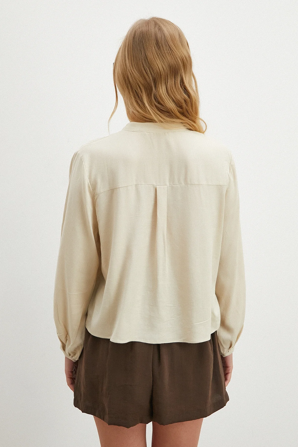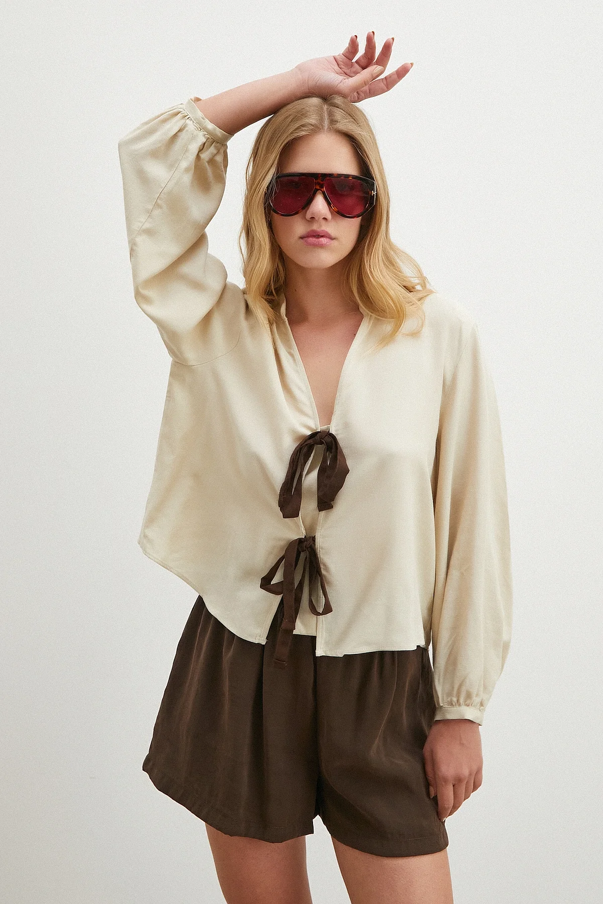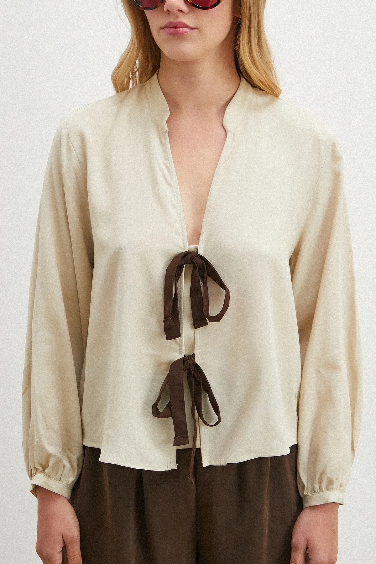 Beli Kuşaklı Viskon Bluz - Bej
