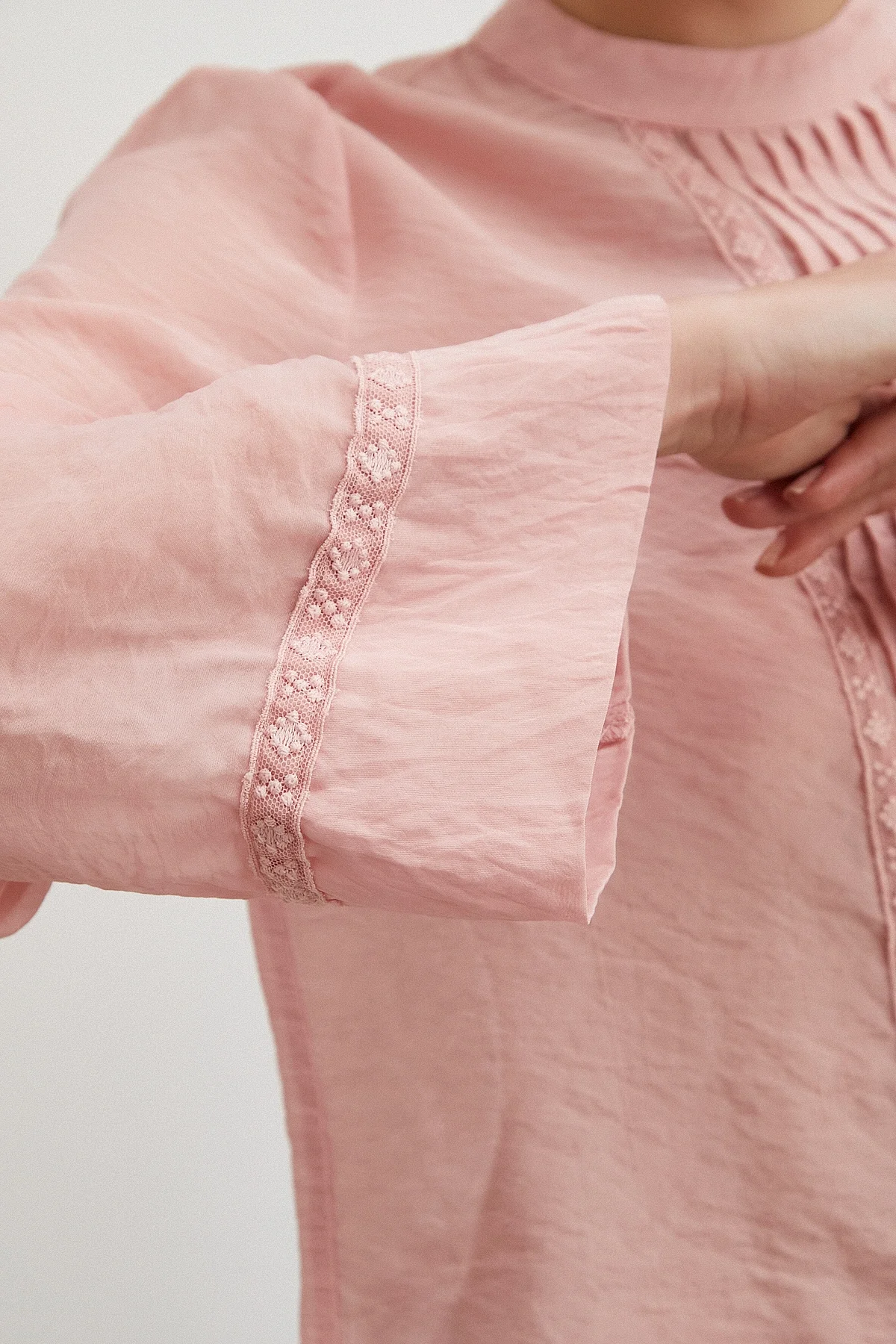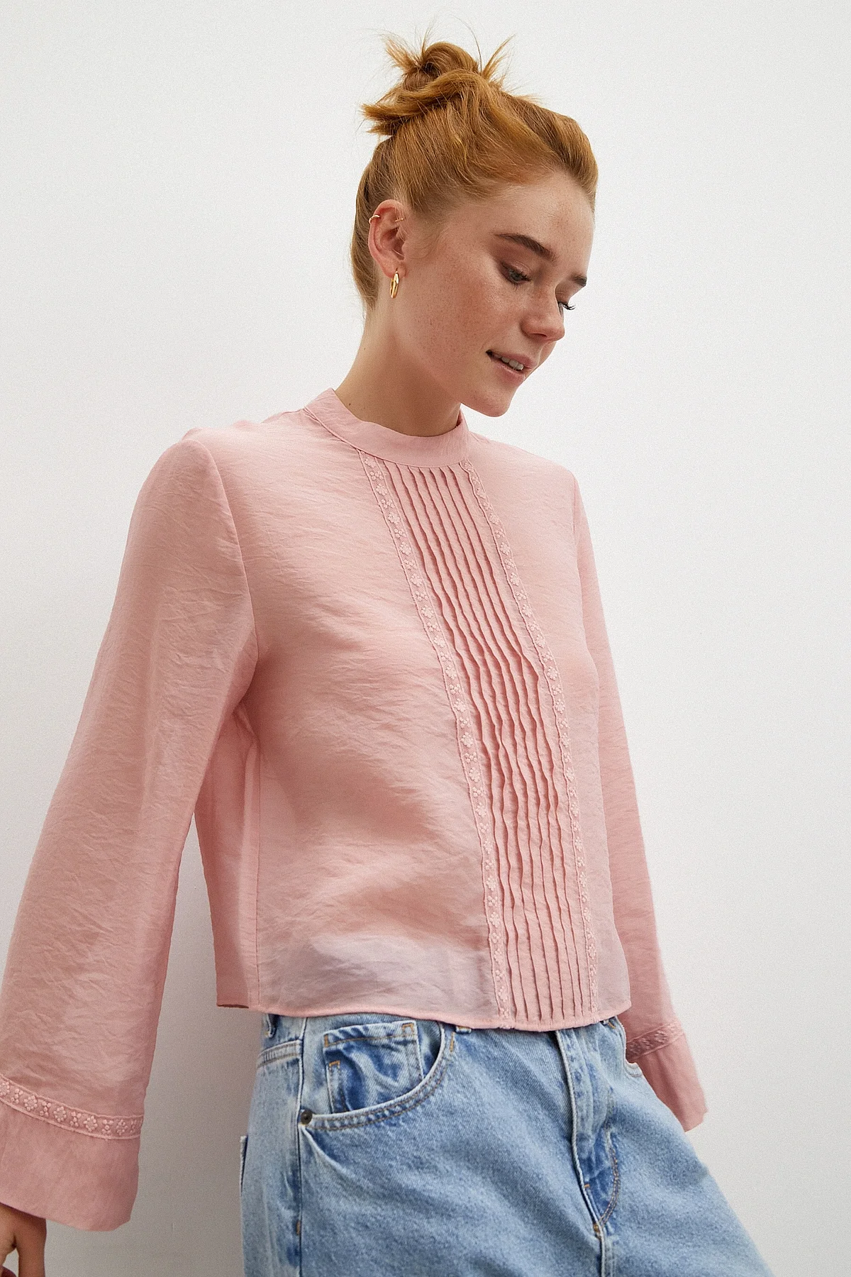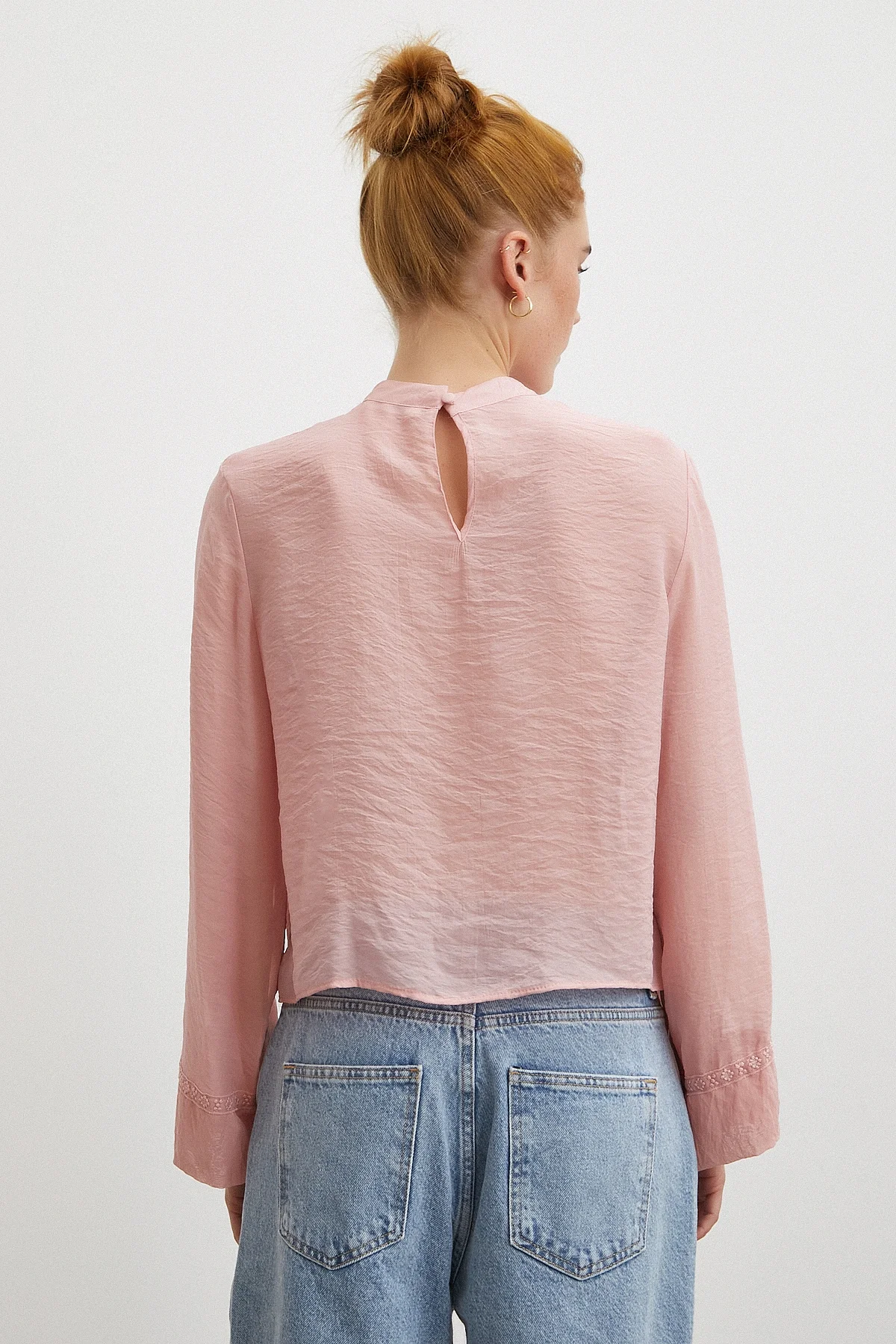 Dantel Kesimli Uzun Kollu Bluz - Pembe