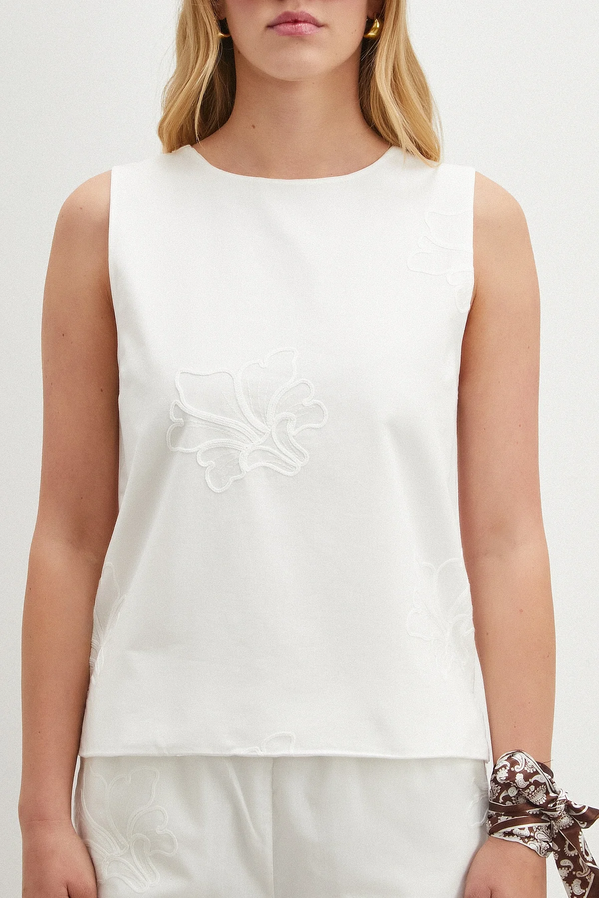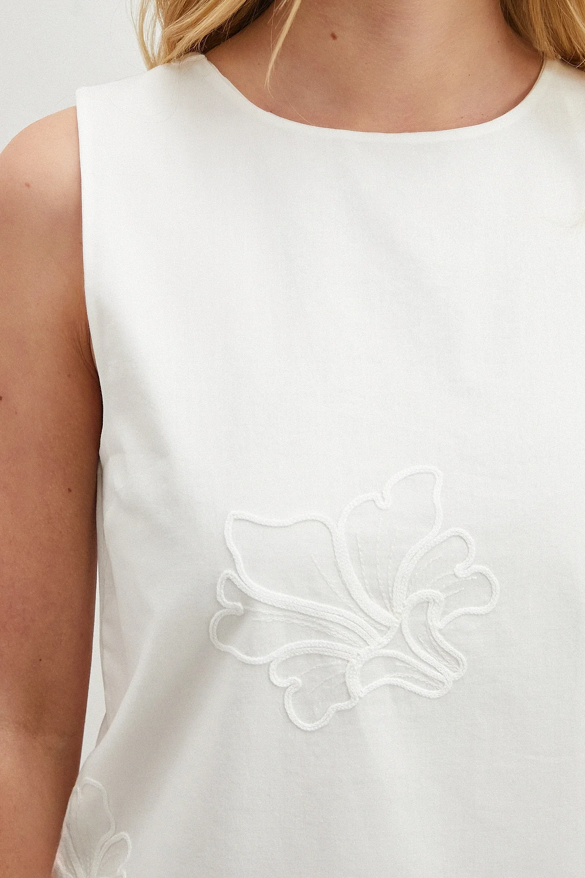 Nakışlı Sıfır Kol Bluz - Beyaz